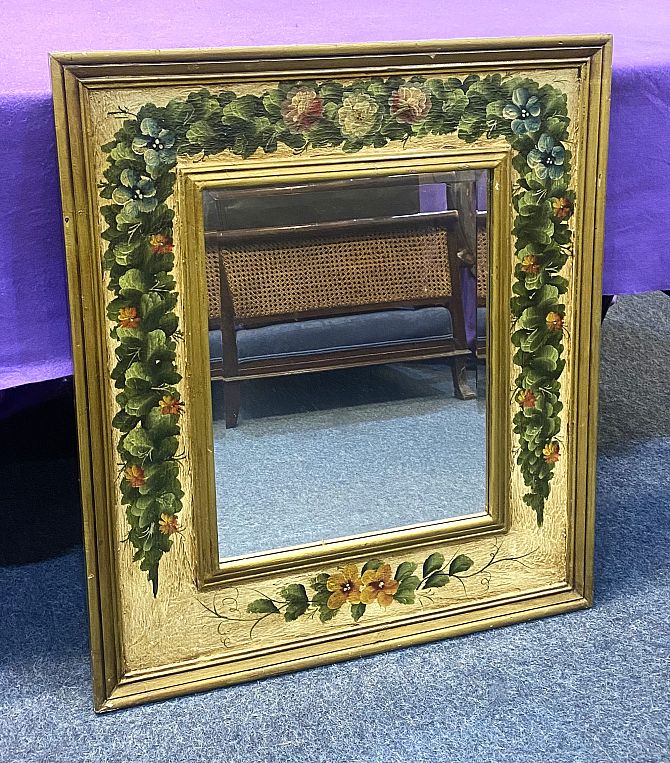 A bevelled rectangular wall mirror, with gilt and painted frame, 20th century, 71cm wide by 82cm high.