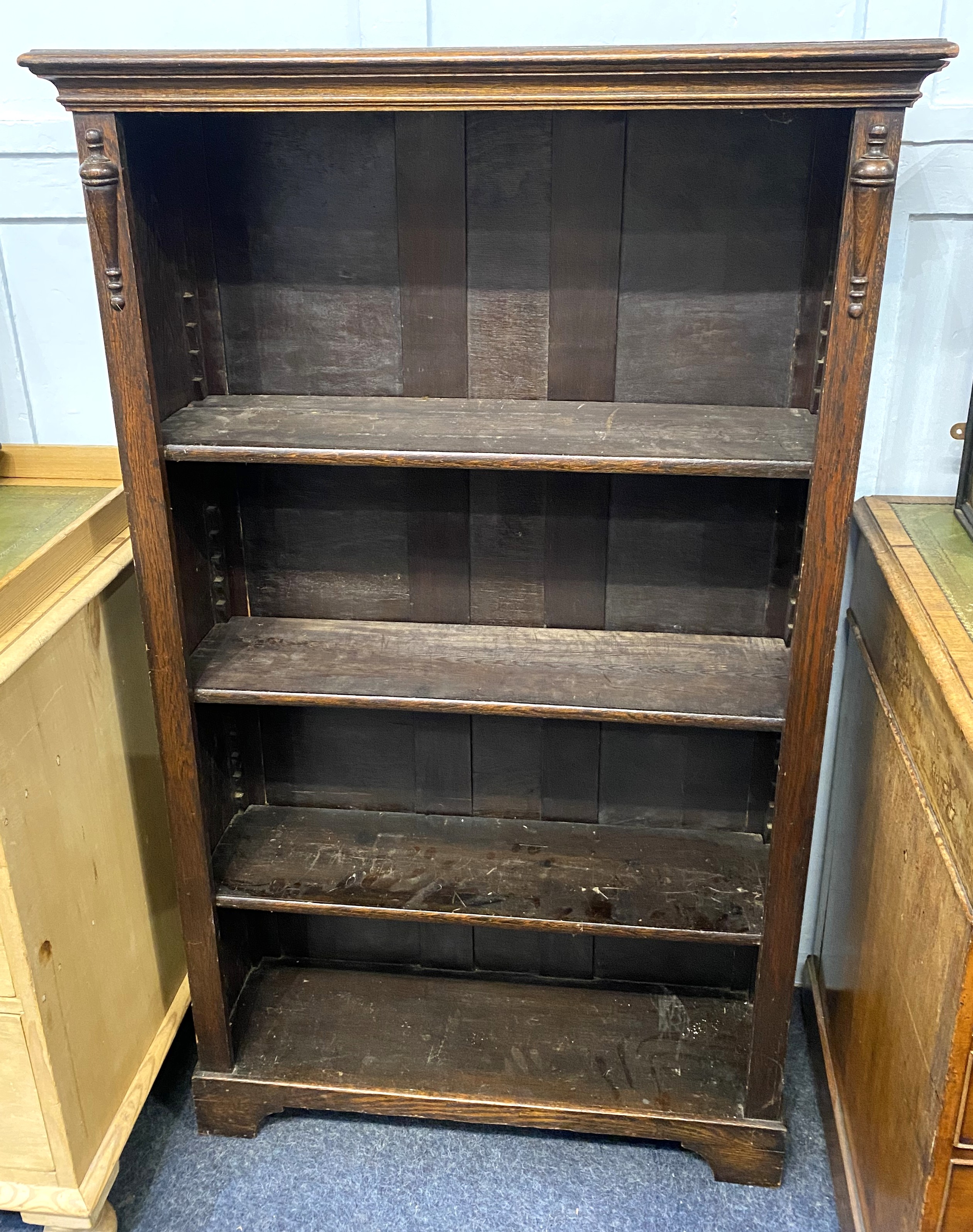 A vintage oak open fronted bookcase, with three adjustable shelves and bracket feet, 75cm wide by 125cm high by 27cm deep.