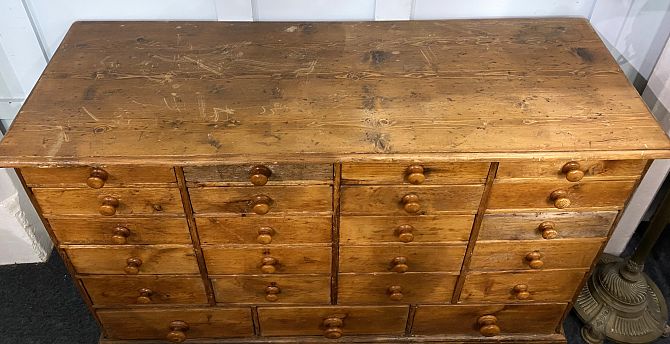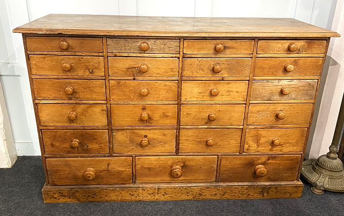 An antique pine chest of twenty three graduated drawers, c. 1900, each with turned knob handle, raised on a plinth base, 137cm wide by 49cm deep by 89cm high.