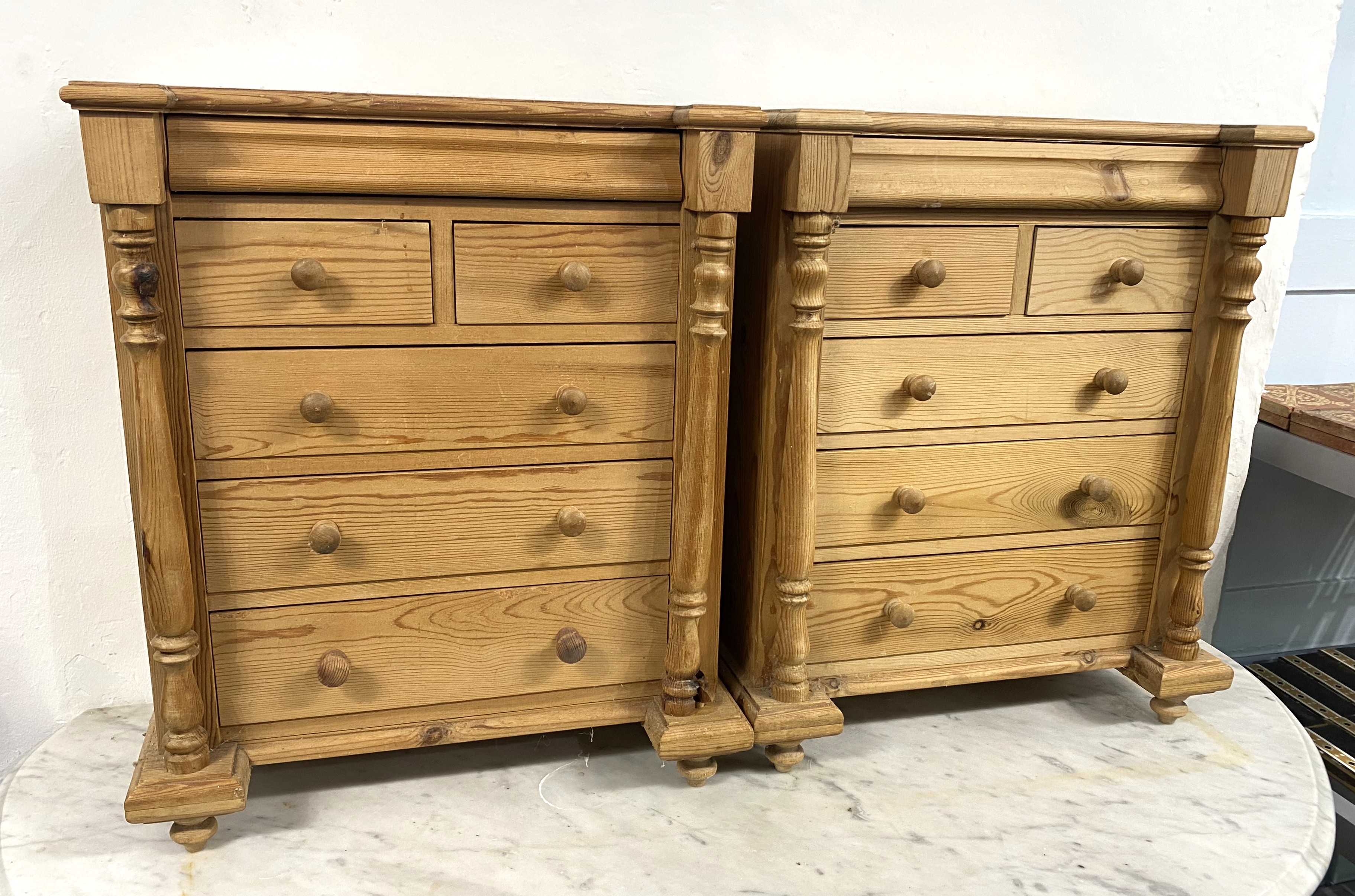 A pair of small pine reverse breakfront chests, late 20th century, each fitted with a hidden frieze drawer above two short and three long graduated drawers, flanked by turned pilasters, raised on toirned bun feet, 56cm high by 46cm wide by 27cm deep.