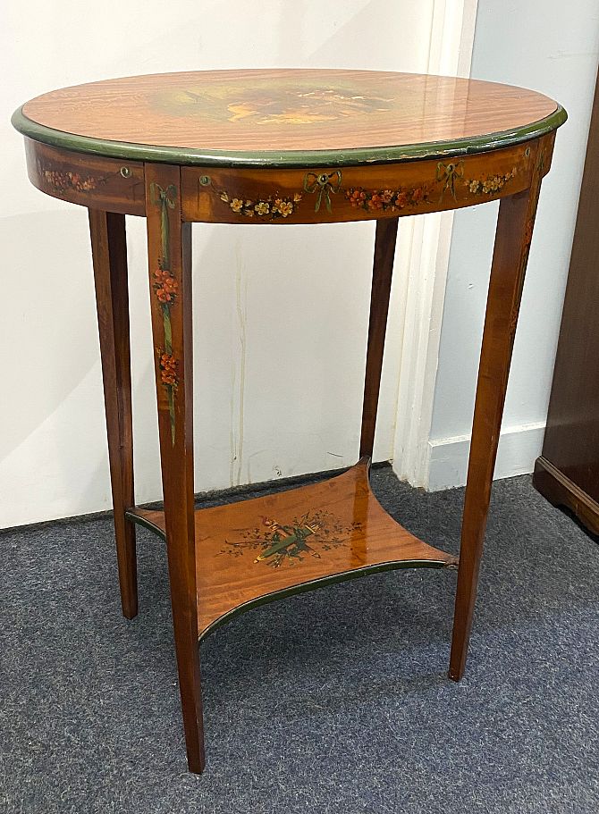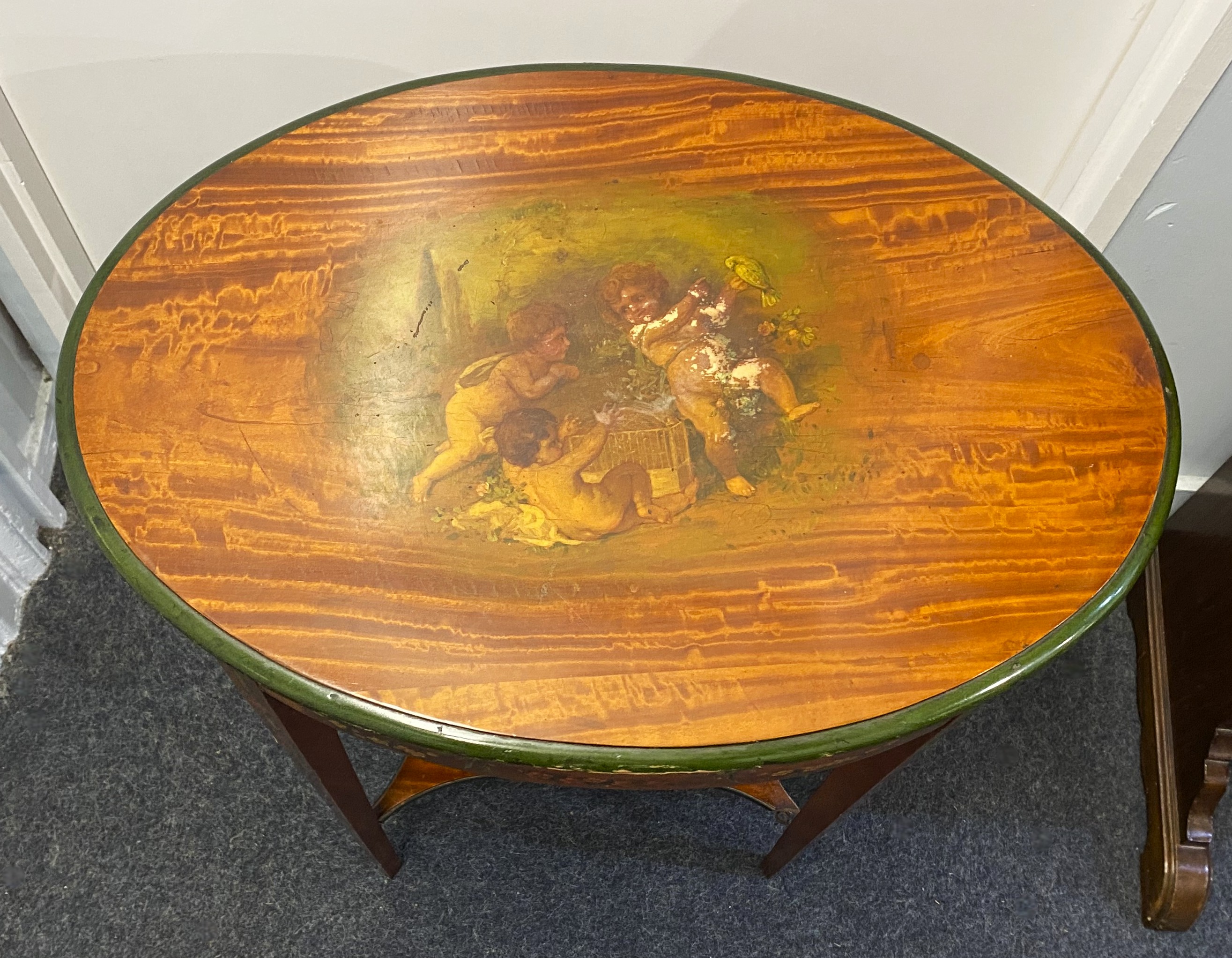 An Edwardian painted satinwood oval side table in the Sheraton taste, decorated with cherubs, musical instruments and floral garlands, 57cm by 40cm, by 72cm high.