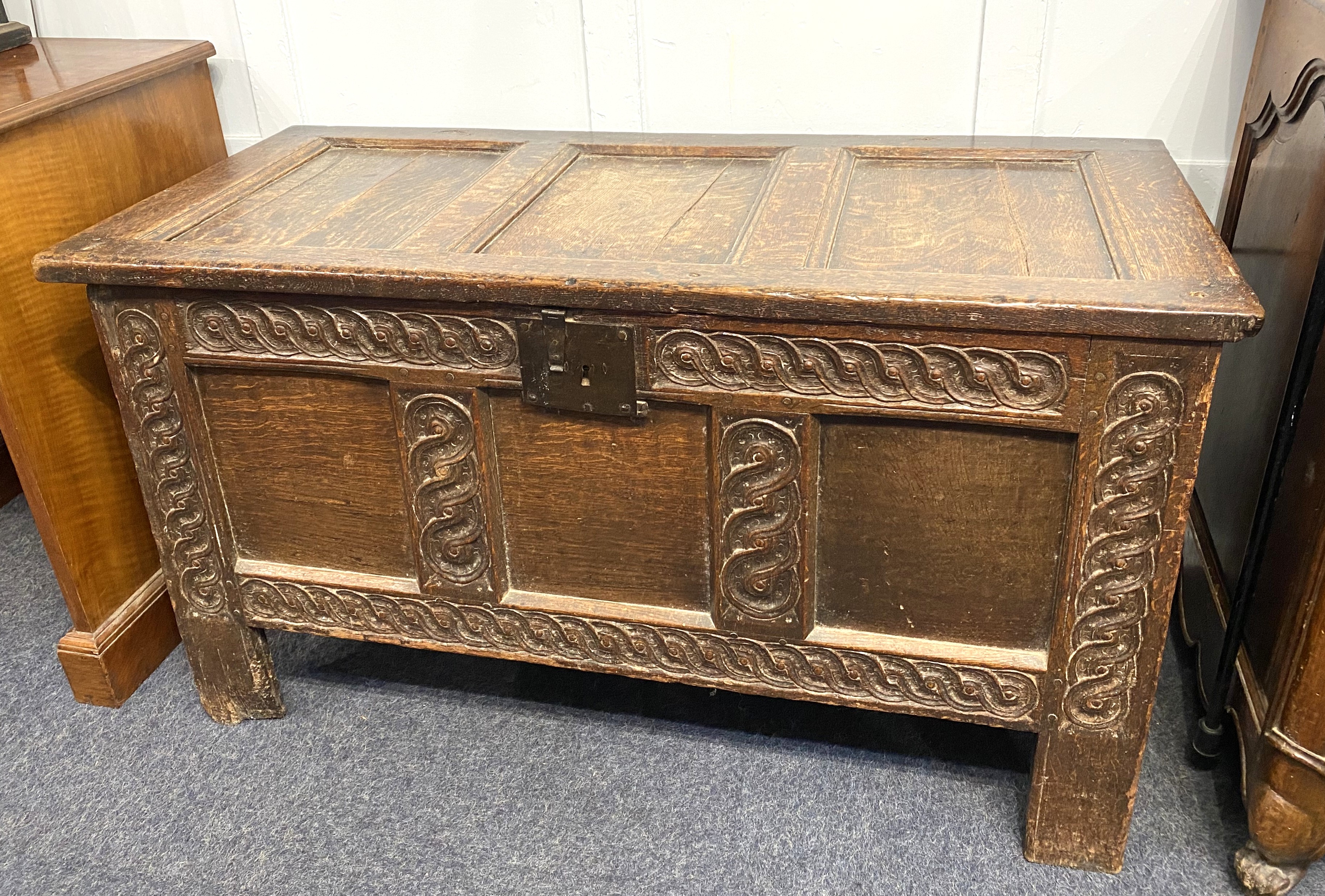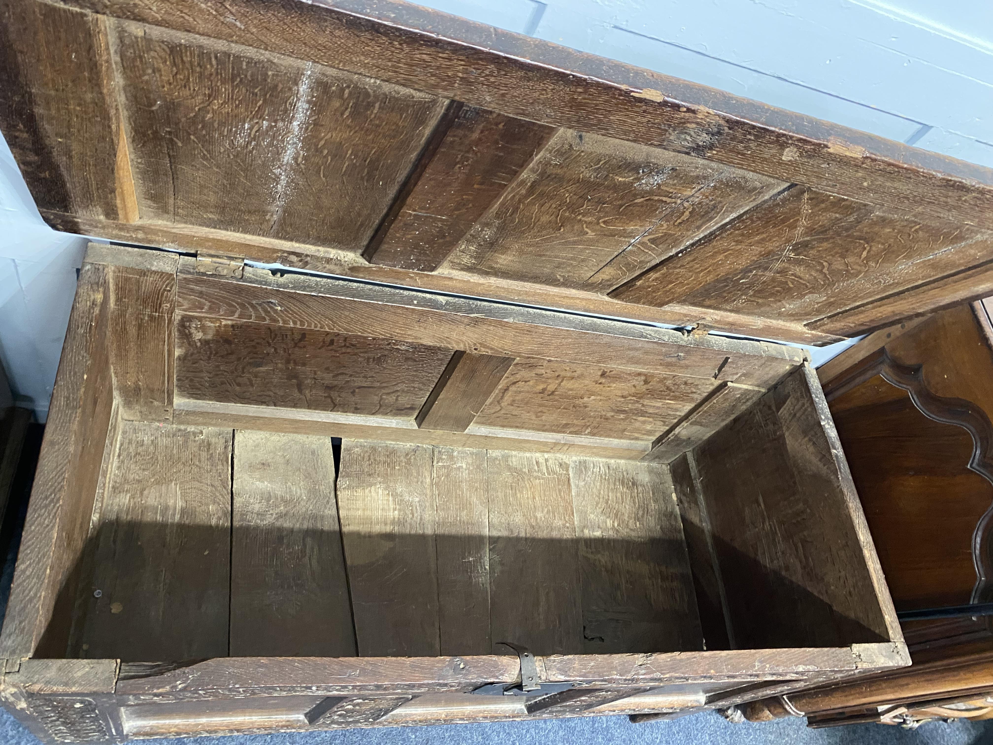 An 18th century carved oak coffer, the hinged top over three panel front, on stile supports height 65cm, width 119cm, depth 53cm (a/f)