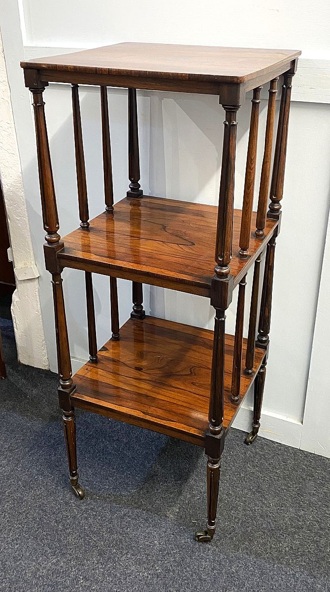 A 19th century rosewood three tier whatnot, with turned and fluted uprights, raised on delicate casters, 44cm wide by 44cm deep by 113cm high.