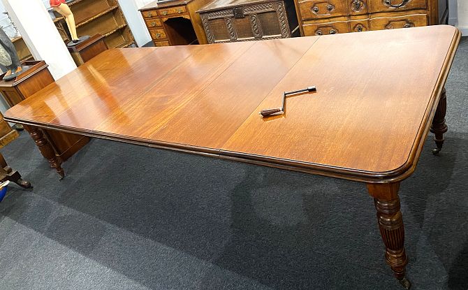 A good quality Victorian walnut wind-action extending dining table, with three extra leaves and winder, the rectangular top with rounded corners and moulded edges, raised on turned and fluted supports terminating on casters, 152cm by 122cm without leaves, each leaf adding an extra 50cm in length, to 300cm (9'10") fully extended,