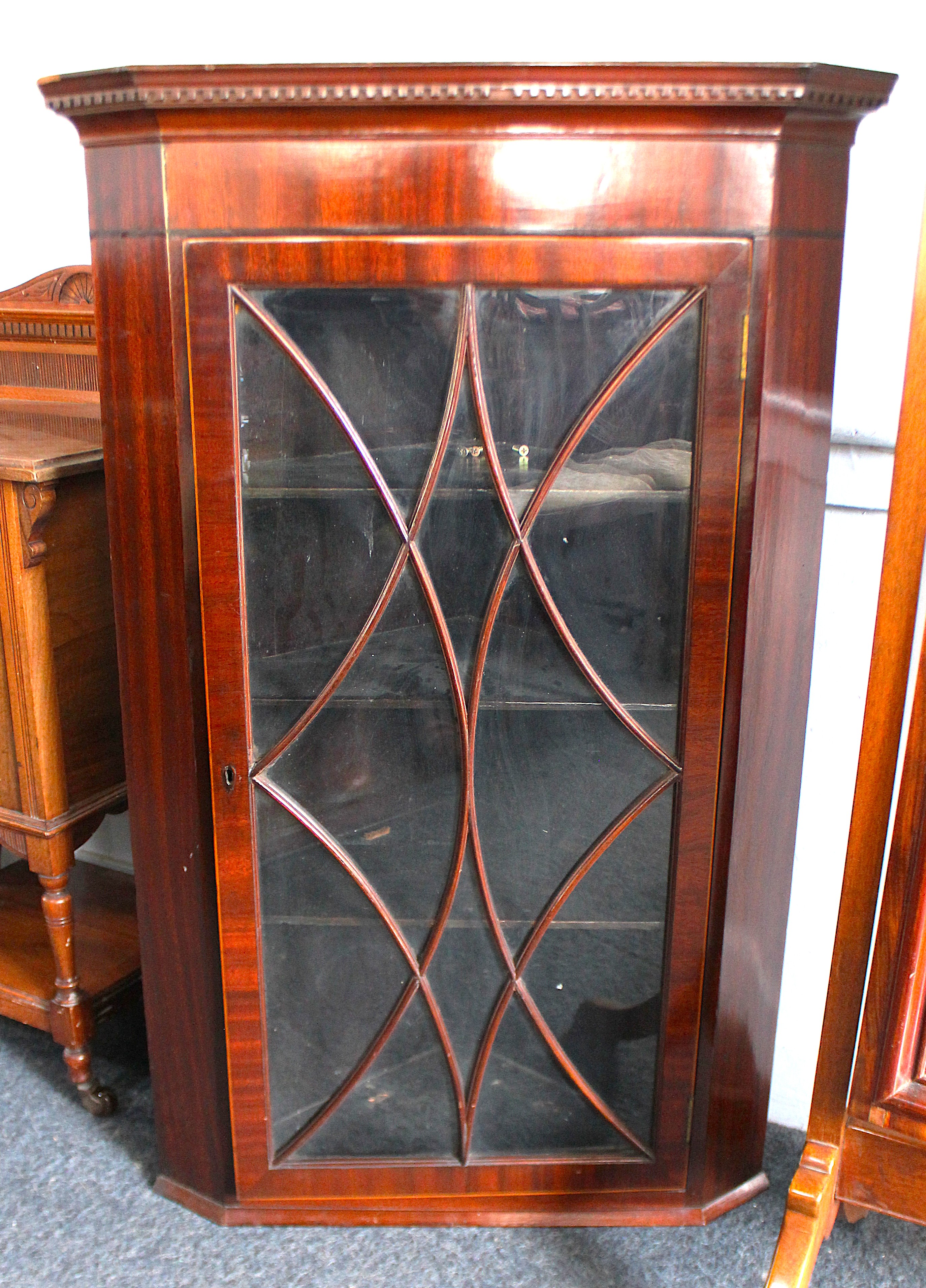 A 19th century mahogany hanging corner cabinet, with an attractive glass panelled door enclosing shelves, 69cm wide by 108cm high.