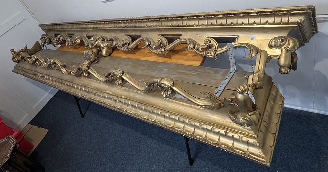 A pair of ornate country house giltwood pelmets, 264cm wide by 34cm deep, (af).
