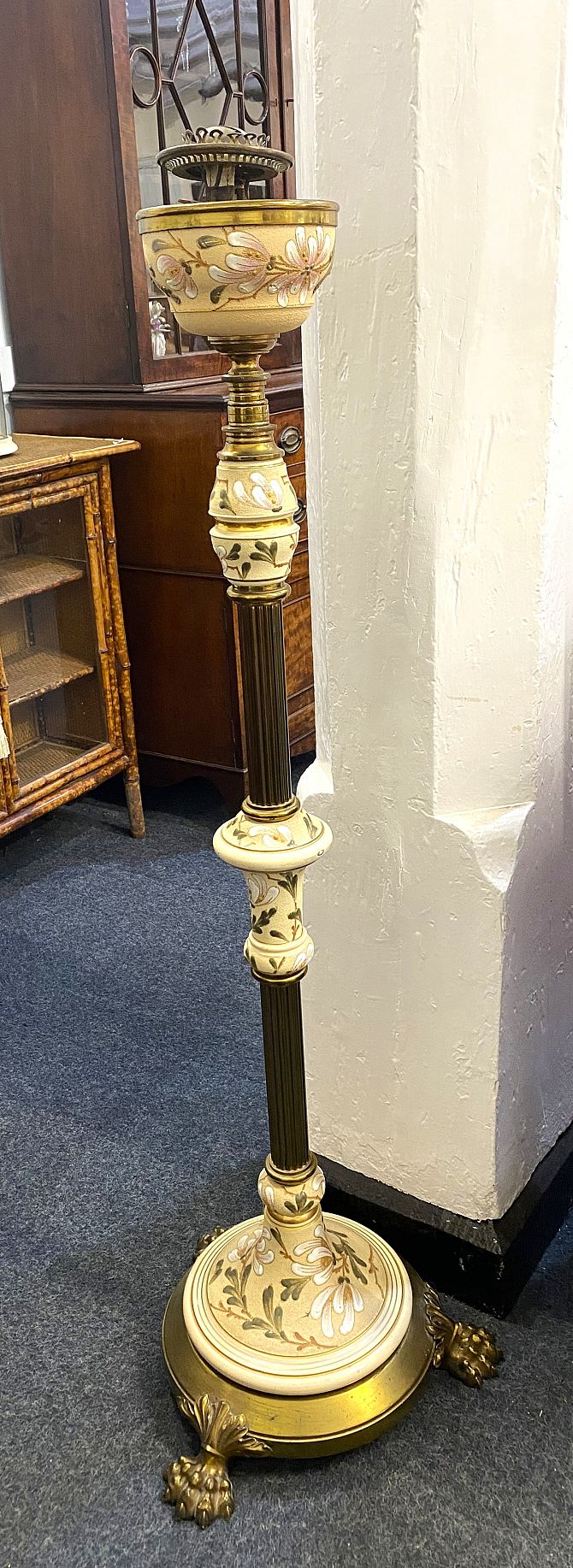 A Royal Doulton style ceramic and brass oil standard lamp (the removable well broken), could also be used as a jardiniere stand, painted with snowdrops, on circular base and three paw feet 128cm high