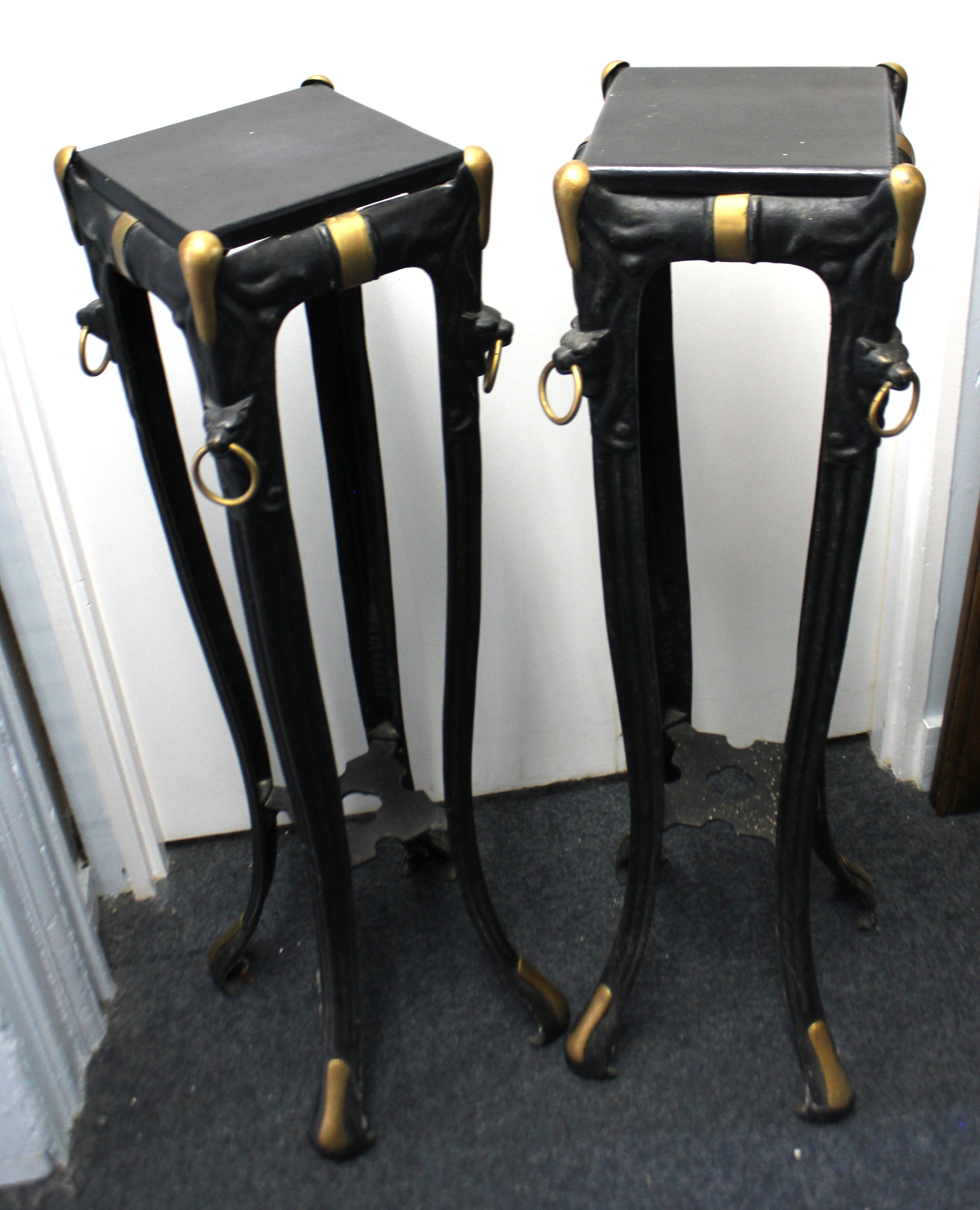 A pair of Art Nouveau style cast iron torchieres with metal top, the supports with cast masks and gilt embellishments 88cm high
