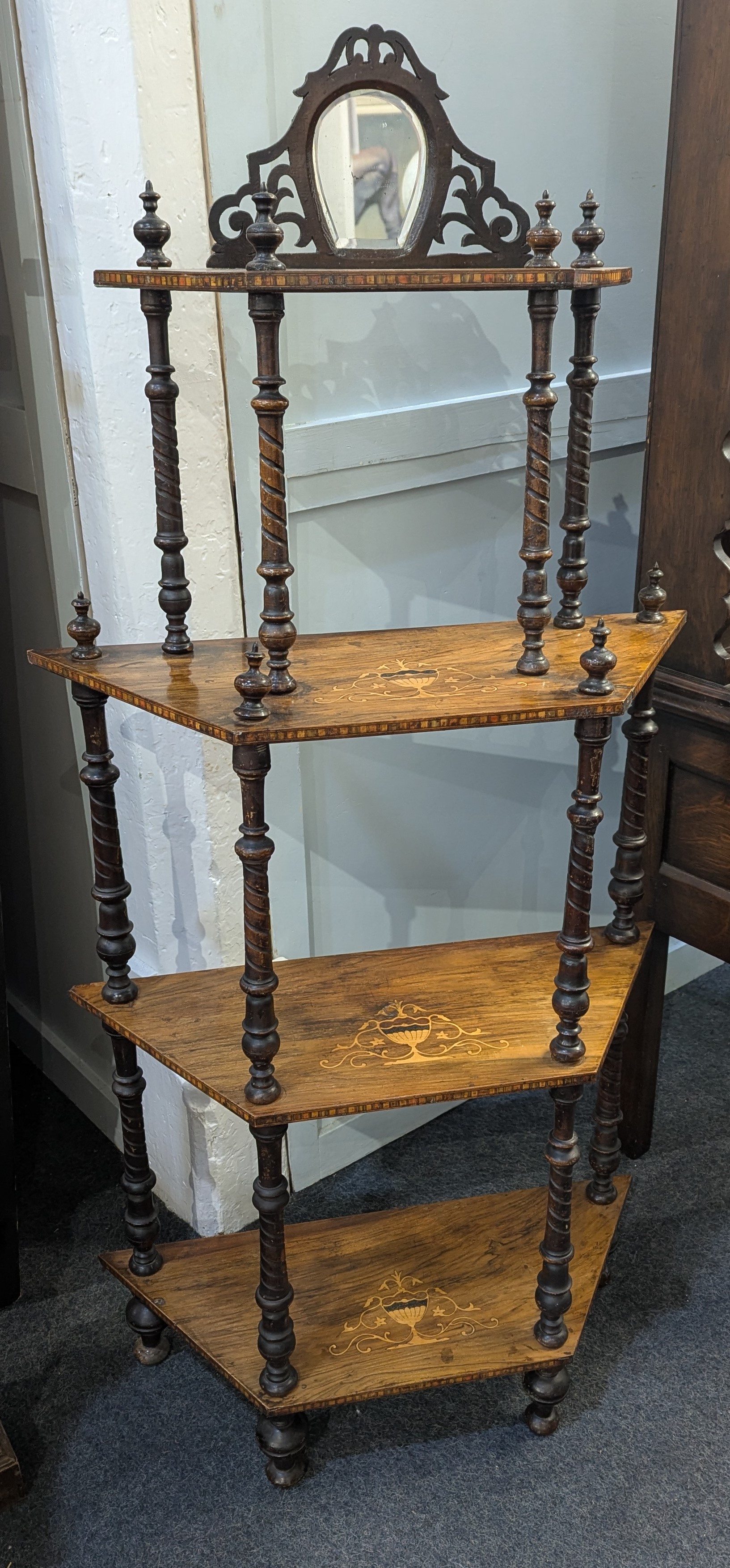 A Victorian walnut inlaid four-tier whatnot, with mirror backed surmount above angled shelves with urn inlay, on turned supports, 146.5cm high, 70cm wide