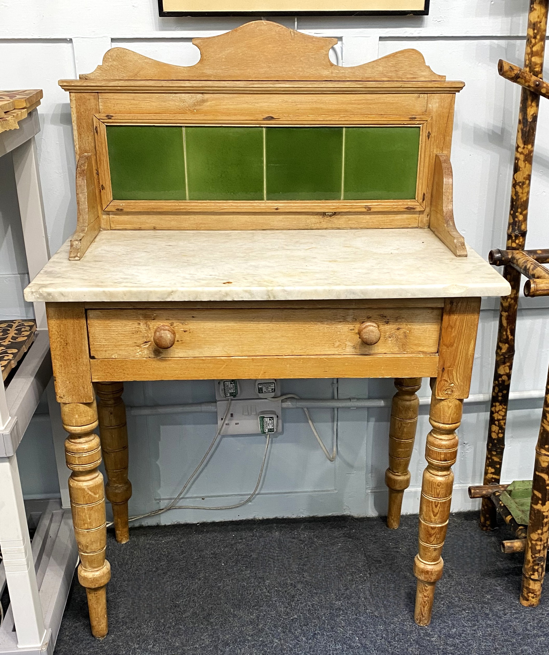 A Victorian pine washstand, the raised back inset with four green glazed tiles above a rectangular marble top and single drawer, on turned legs, height 112cm, width 76cm, depth 41cm