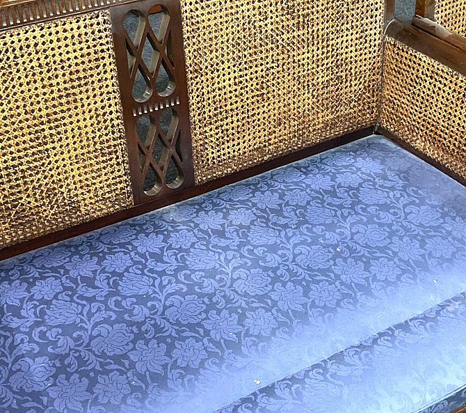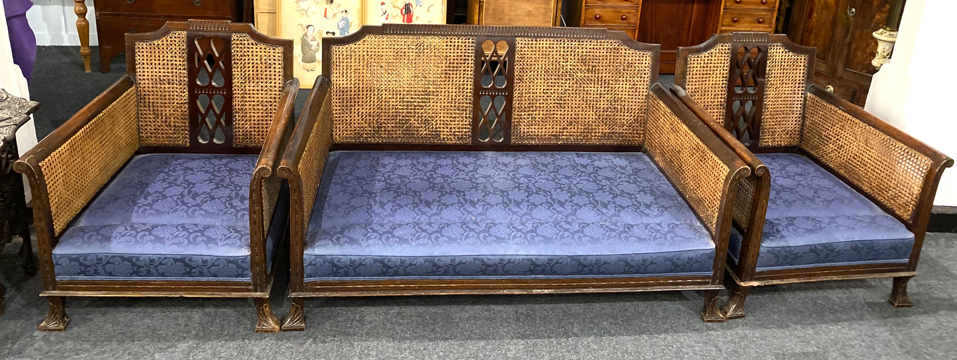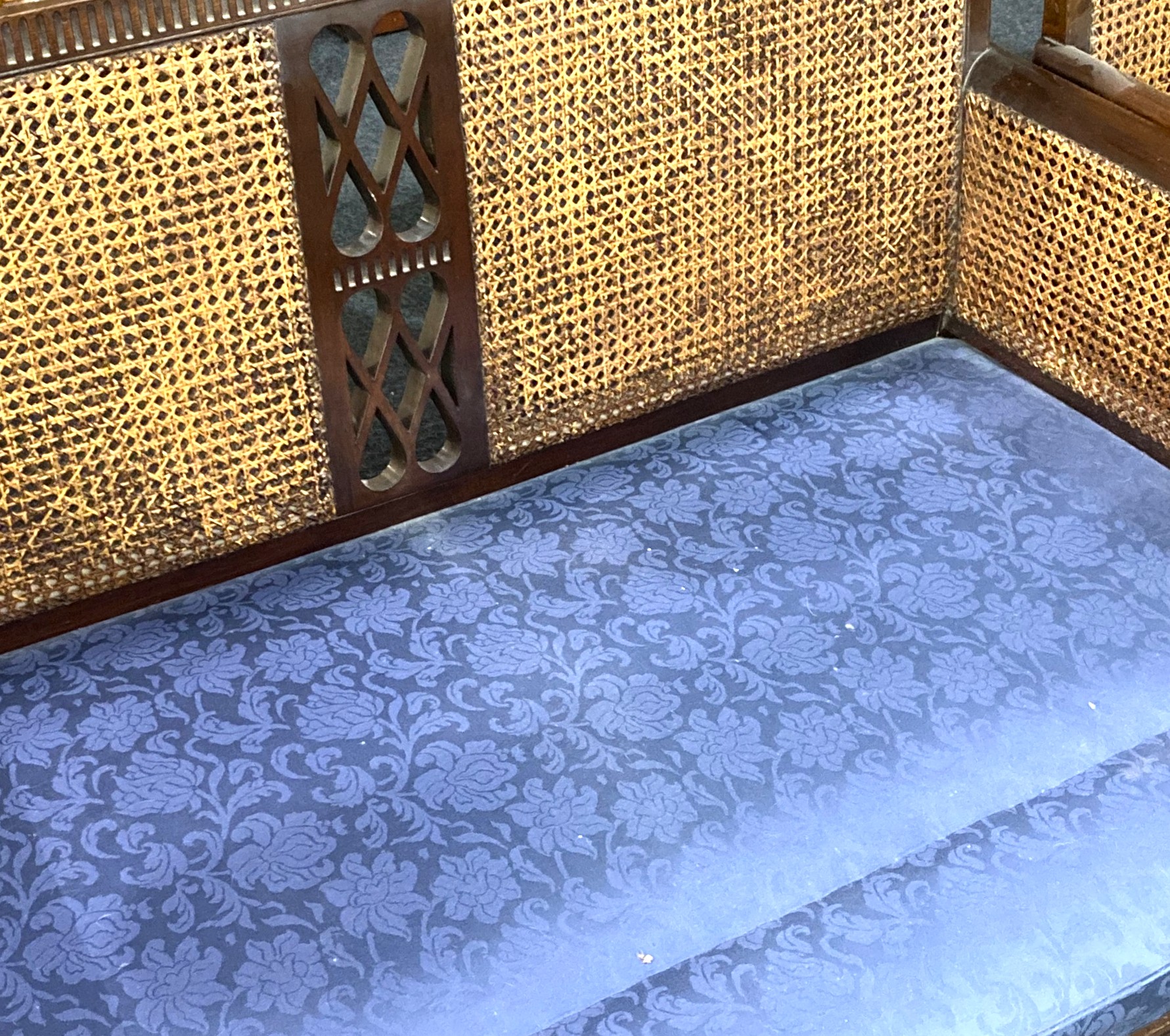 A Bergere lounge suite with canework panel sides and backs comprising two seater sofa width 132cm, height 78cm, depth 77cm, and two matching armchairs