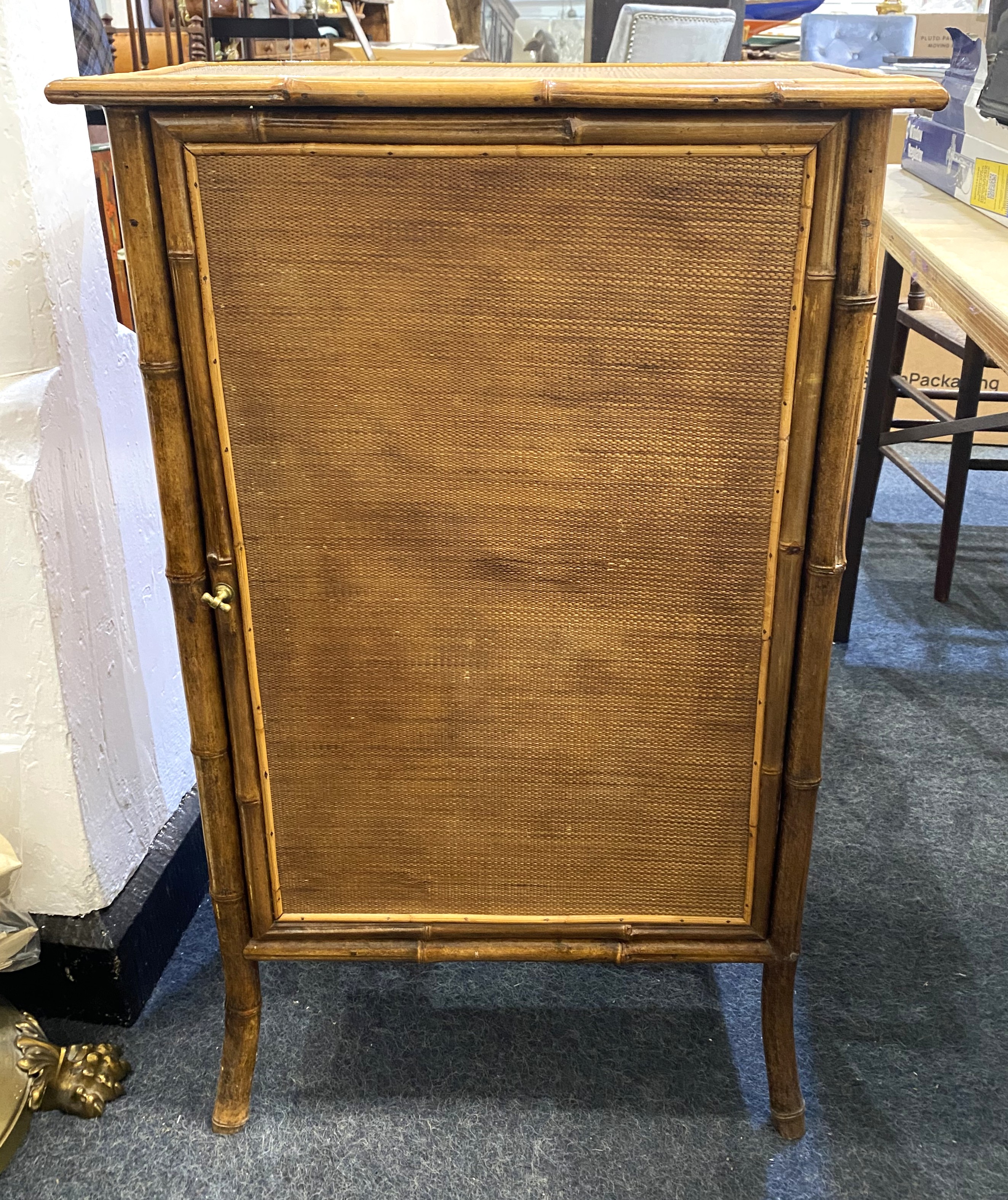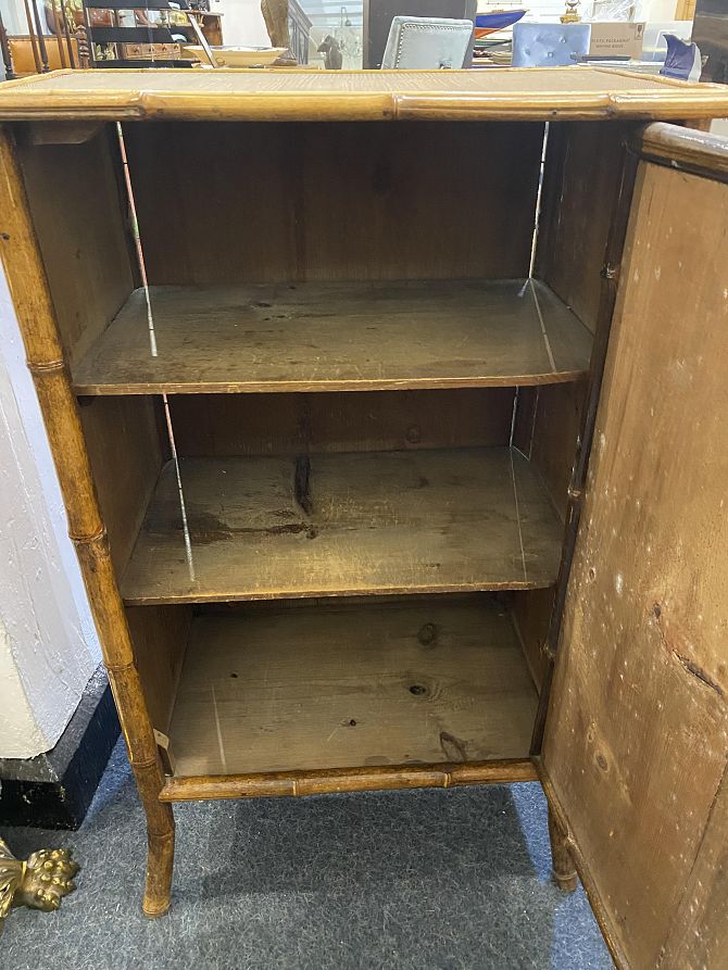A bamboo and rattan cupboard with panel door enclosing two shelves, height 90cm, width 56cm, depth 35cm