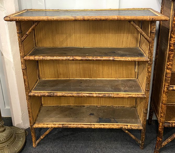 A bamboo and black lacquered open bookcase with three shelves height 99cm, width 92cm, depth 33cm