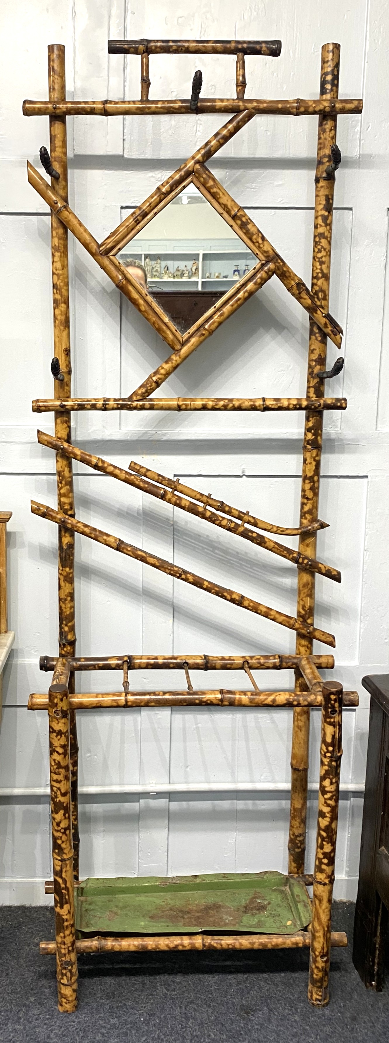 A tiger bamboo hall stand with diamond shaped mirror and green metal drip tray height 194cm, width 64.5cm, depth 30cm