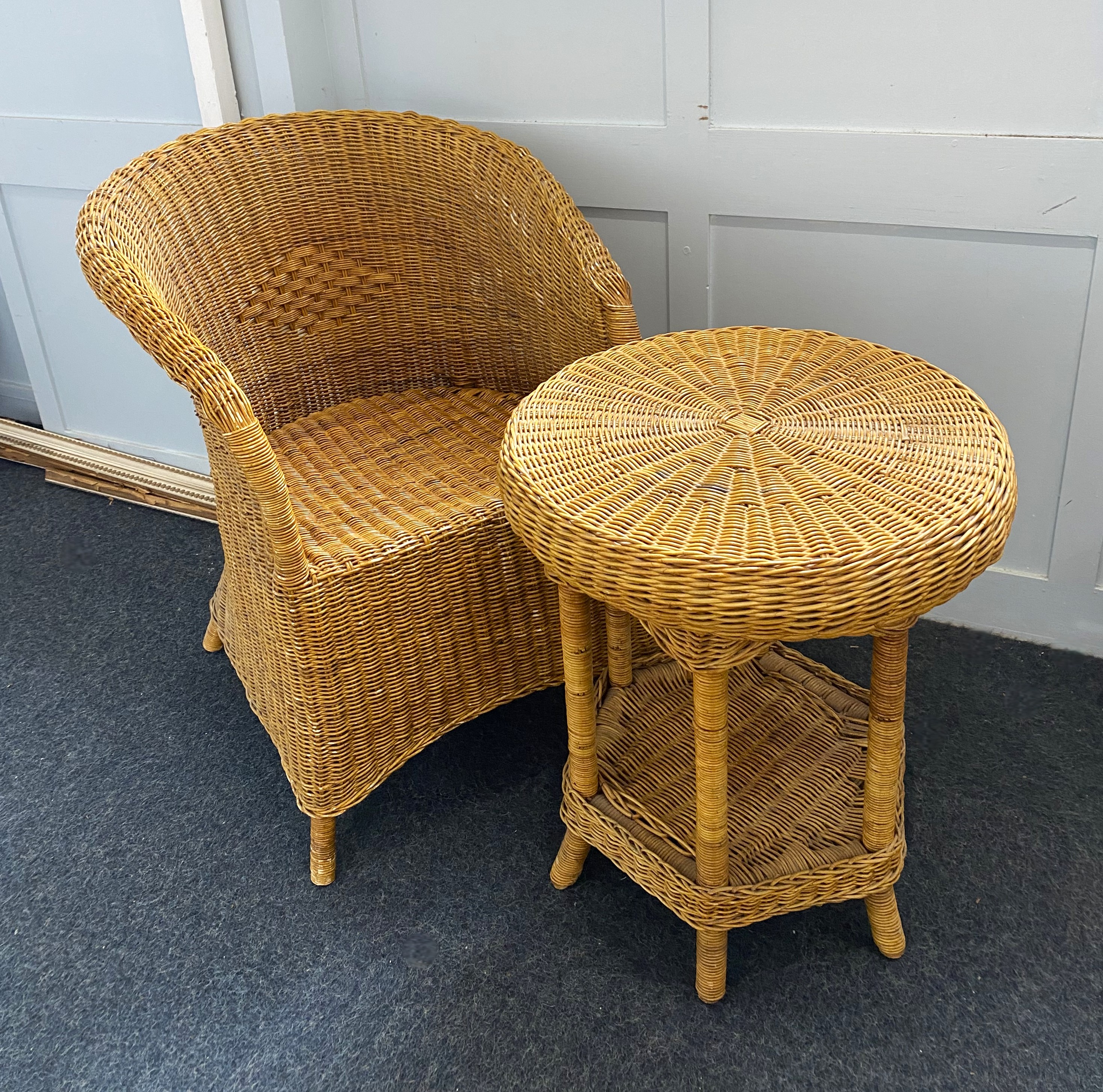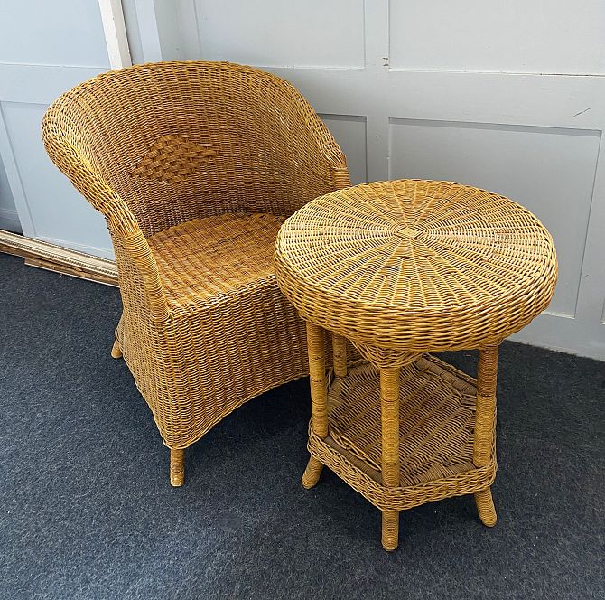 A wicker conservatory chair and matching circular side table with undershelf