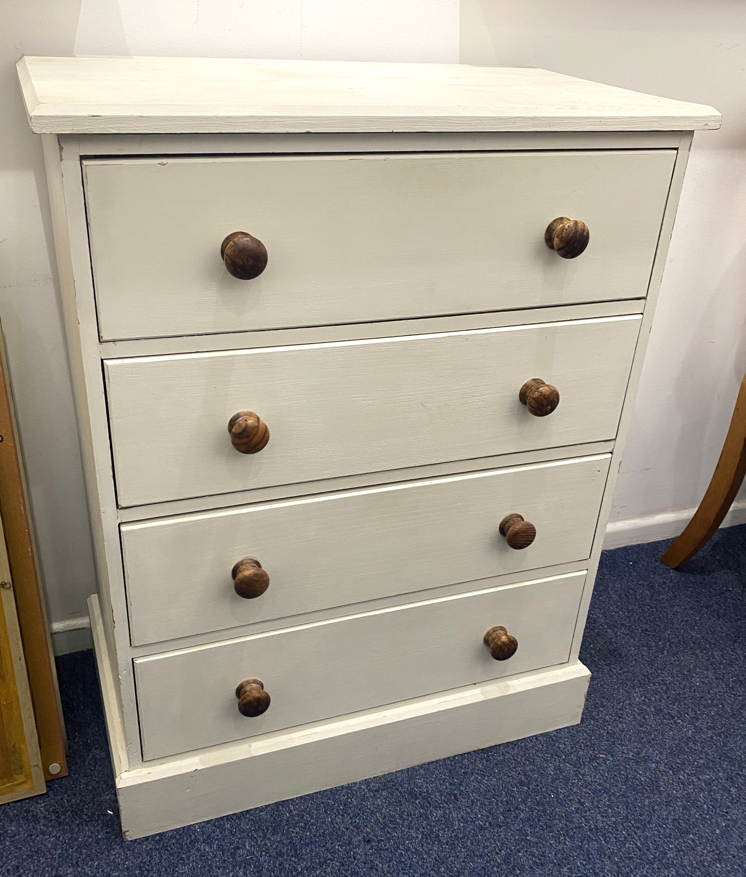 A white painted pine chest of four long drawers, with stripped pine turned knob handles, raised on a plinth base, 76cm wide by 44cm deep by 99cm high, modern.