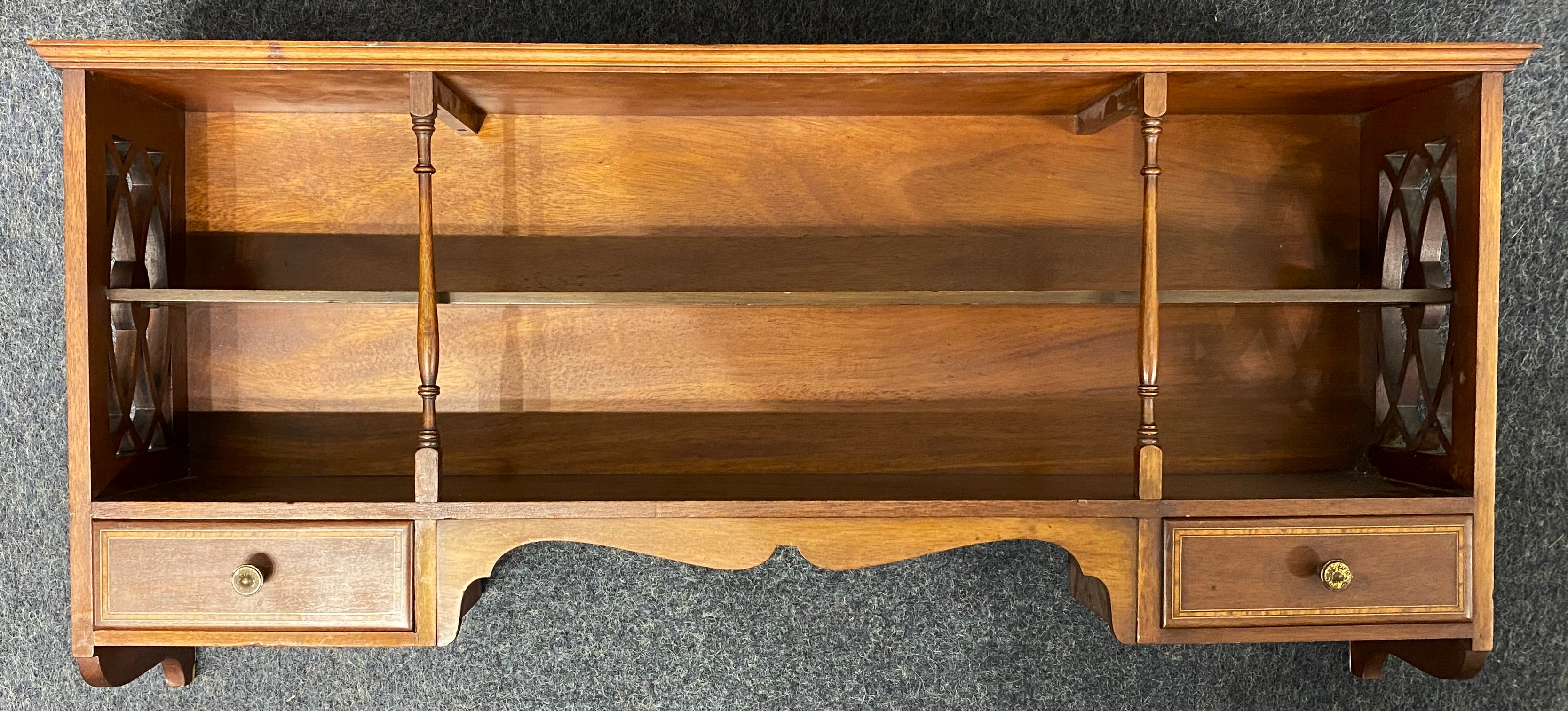 An Edwardian inaid mahogany hanging wall shelf, with open tiers, pierced end panel, turned pilasters, and two small drawers, 84cm wide by 40cm high by 18cm deep.