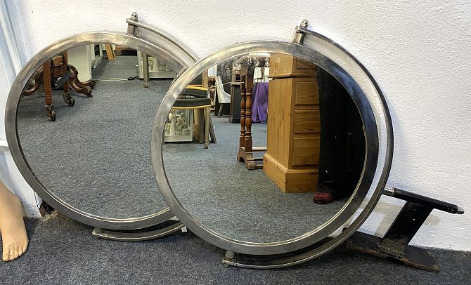 A pair of industrial style wall mounted circular swivel mirrors, in silvered metal frames, 61cm diameter.
