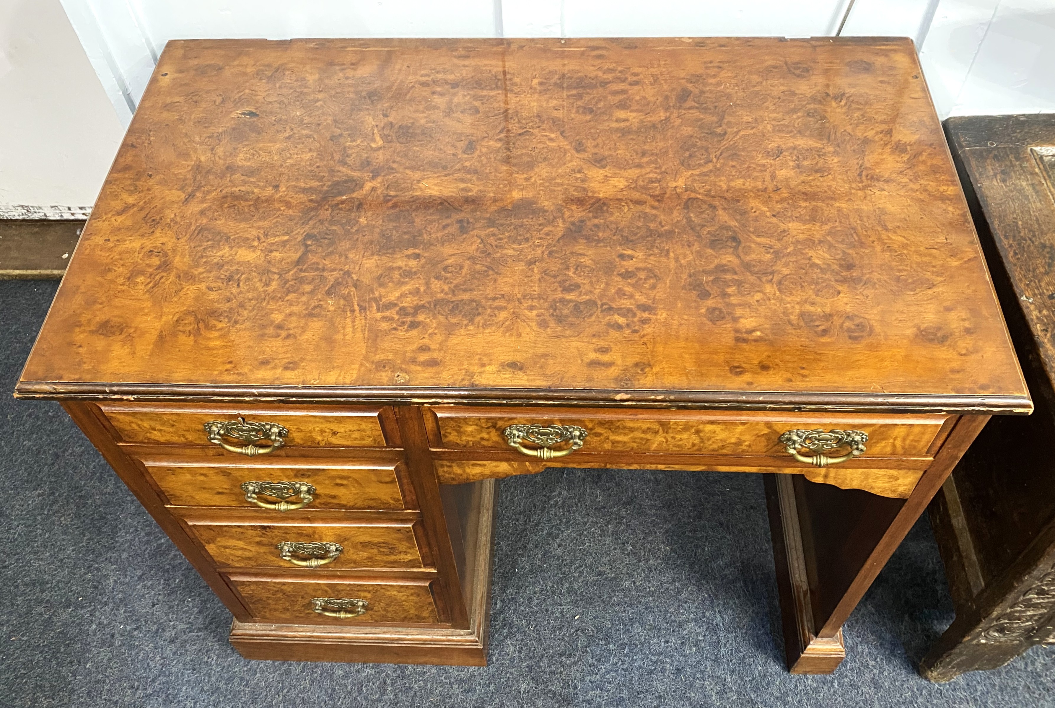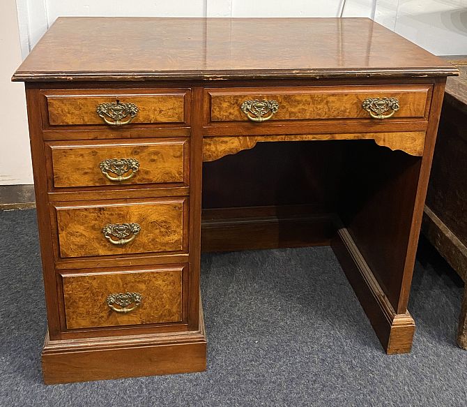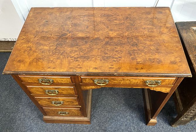 An Edwardian figured walnut desk of small proportions, fitted with five drawers (one lined and fitted), 90cm wide by 51cm deep by 77cm high.