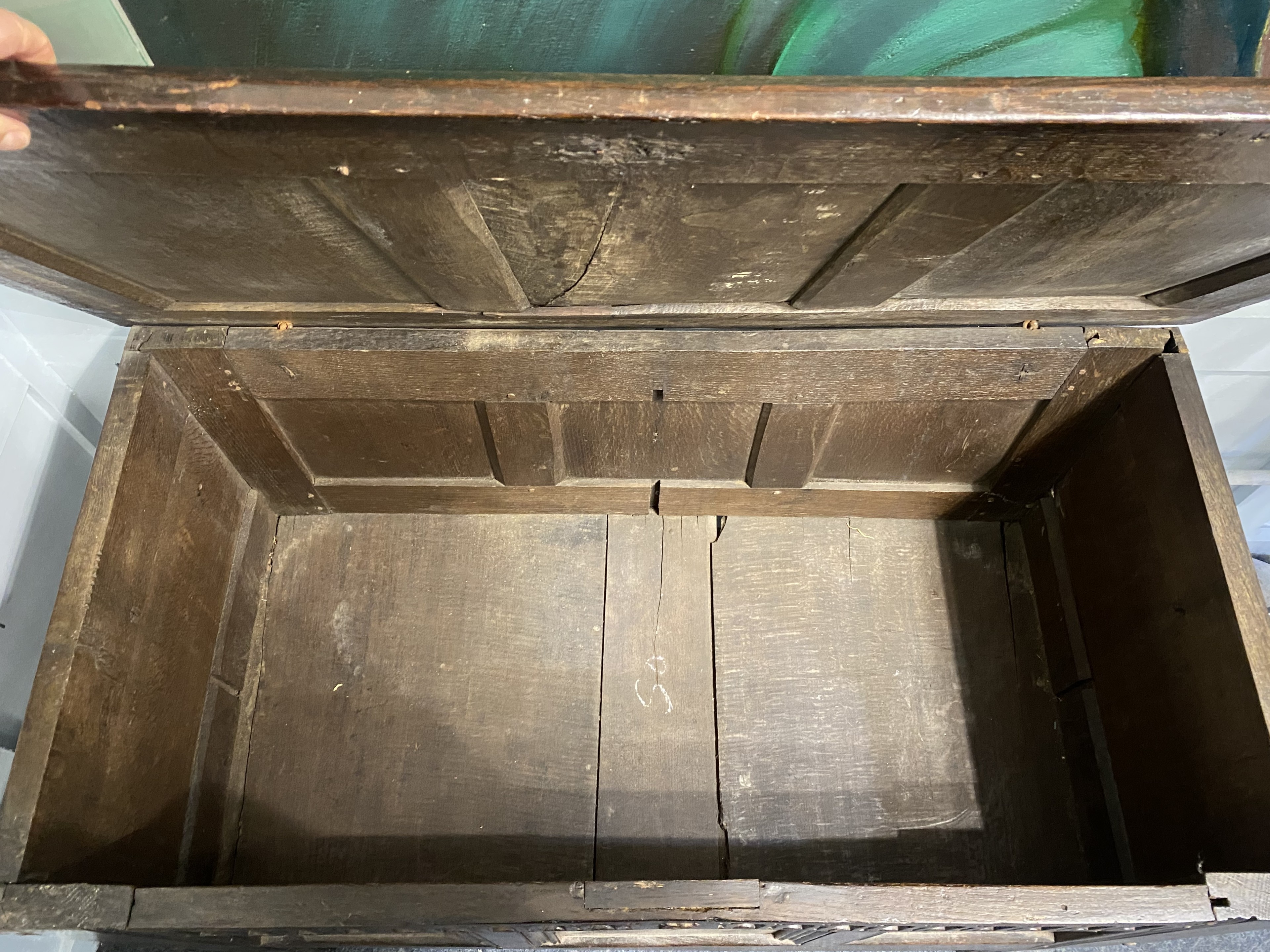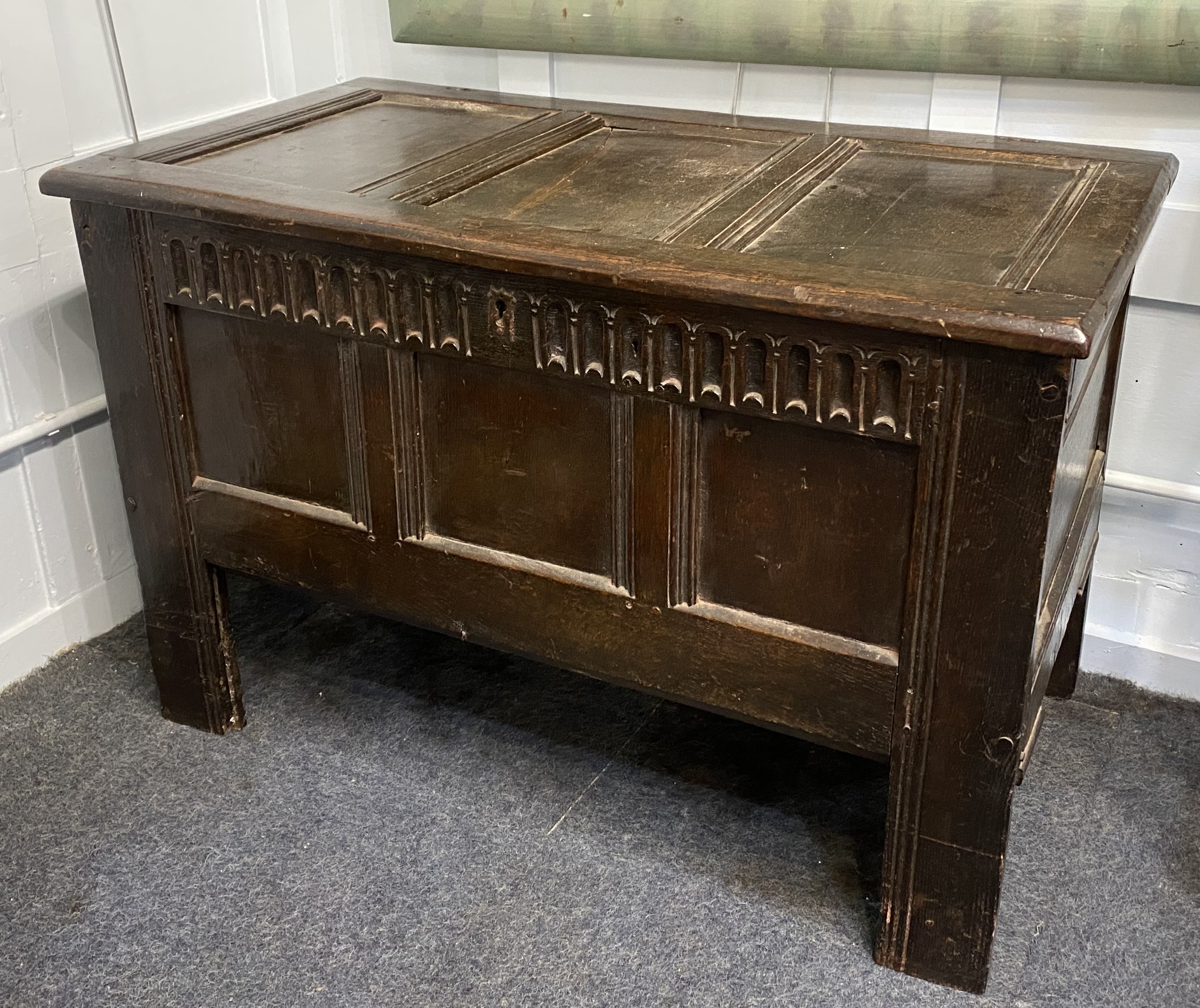 A late 17th / early 18th century panelled oak coffer, with chisel carved fieze and long stile feet, 105cm wide by 56cm deep by 68cm high.