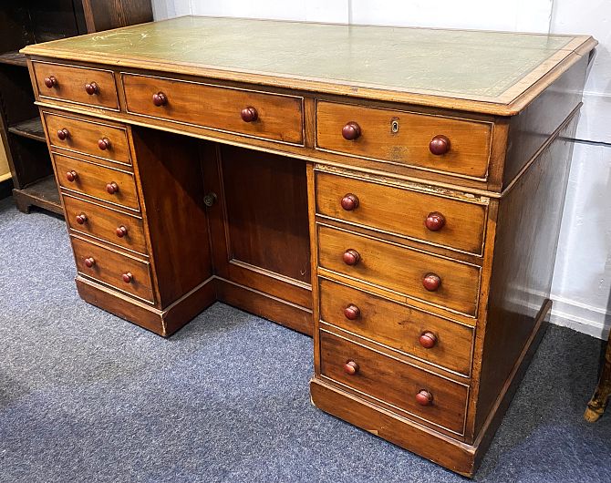 A Victorian pedestal desk with rectangular inset top above nine drawers, on plin...