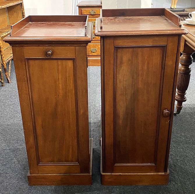A near pair of 19th century mahogany pedestal bedside cabinets / side cabinets, each with three quarter gallery above a panelled cupboard door, raised on plinth bases, 41cm wide by 37cm deep by 90cm high and 38cm wide by 37cm deep by 87cm high, (2).