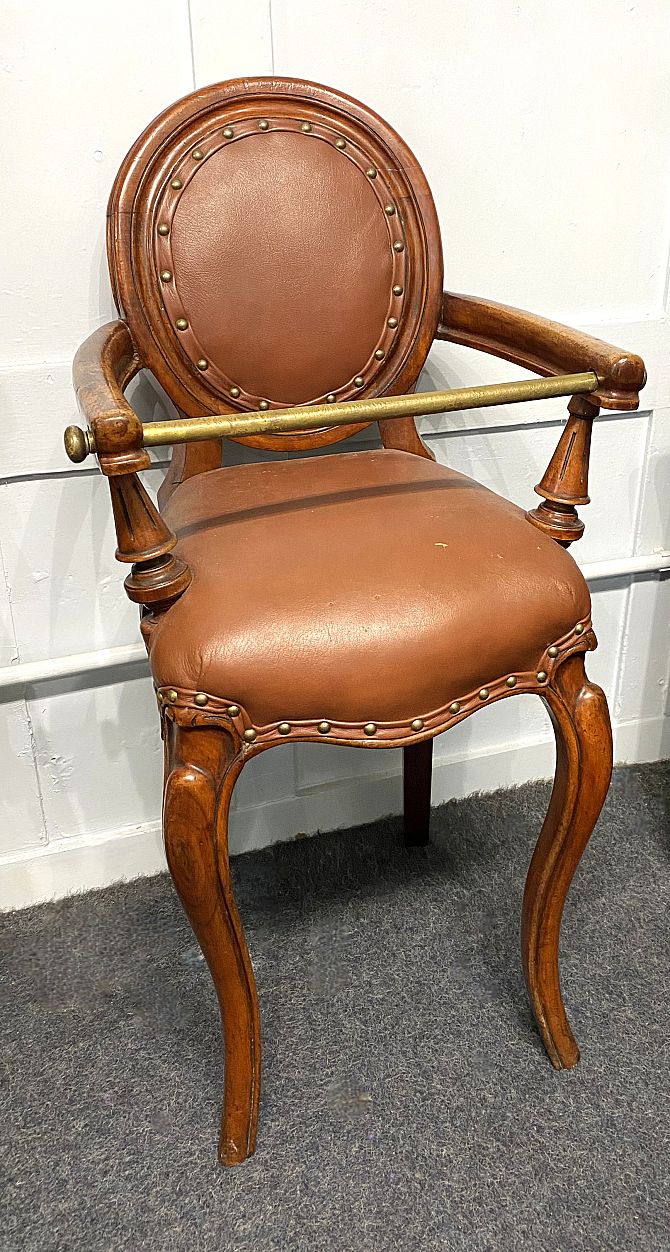 A Victorian brown leatherette upholstered walnut child's high chair, total height 90cm (ideal for displaying antique dolls and teddy bears).