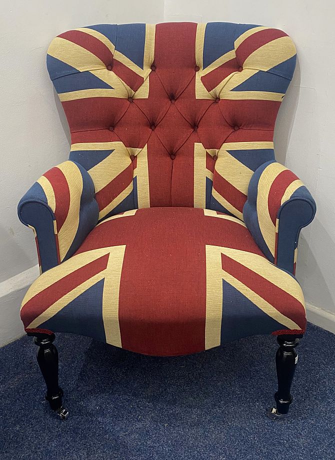 A brand new armchair upholstered in a Union Jack fabric, Victorian style but new, raised on solid wooden legs terminating on brass castors.
