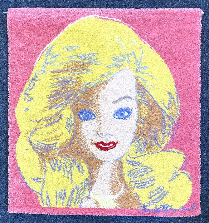 An Andy Warhol 'Barbie 1985' limited edition art rug published by Museum Masters abd approved and endorsed by the Andy Warhol Foundation, number 895 / 1000, 80cm by 85cm, with Certificate of Authenticity and box