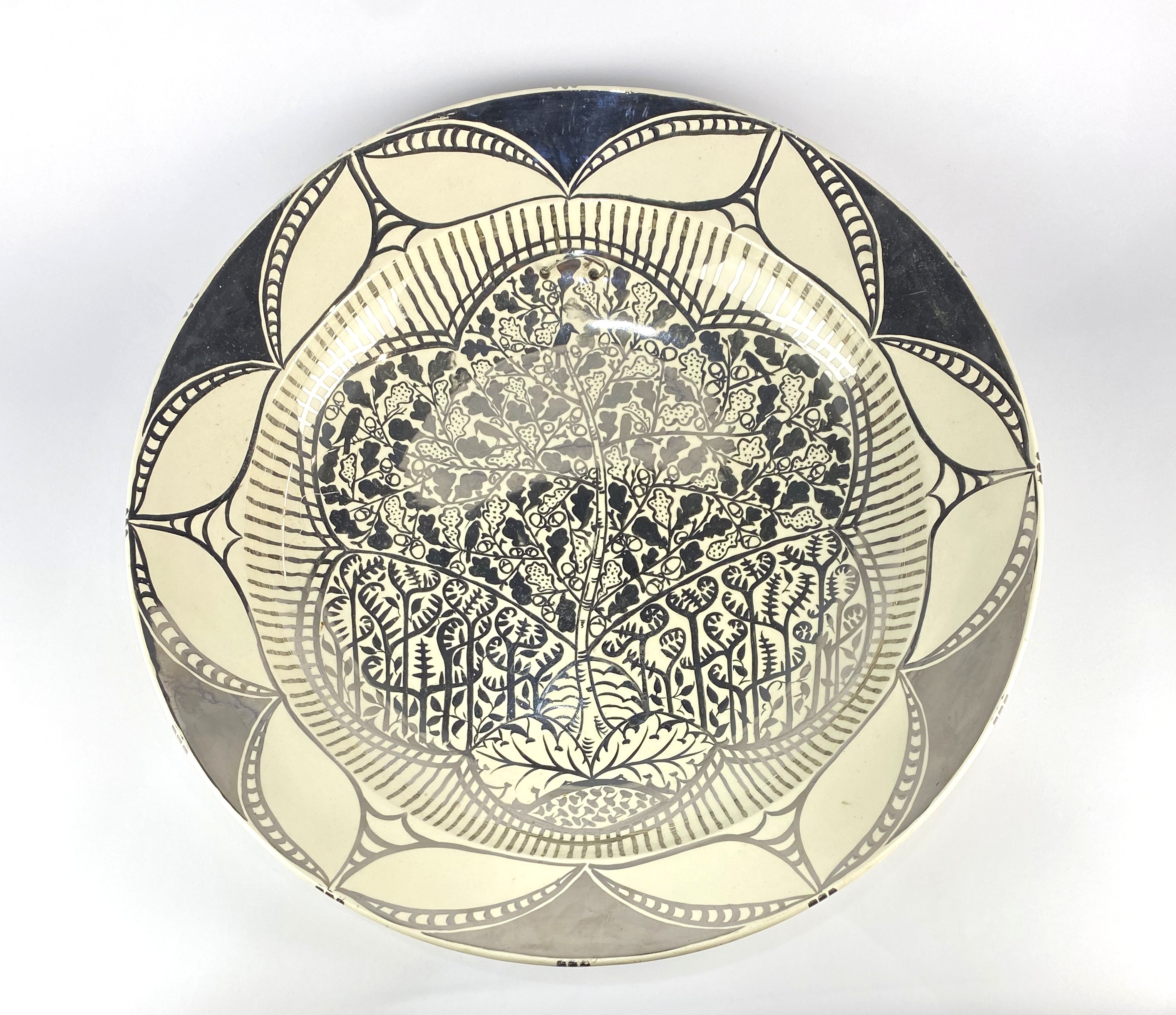 A large Art Pottery silver lustre wall charger by Louise Powell (British, 1865-1956) for Wedgwood, pattern no. 4549, early 20th century, decorated with an oak tree amidst stylised foliage and motifs to the dished circular form, the reverse with artists monogram, pattern number and impressed factory marks, 55cm diameter.